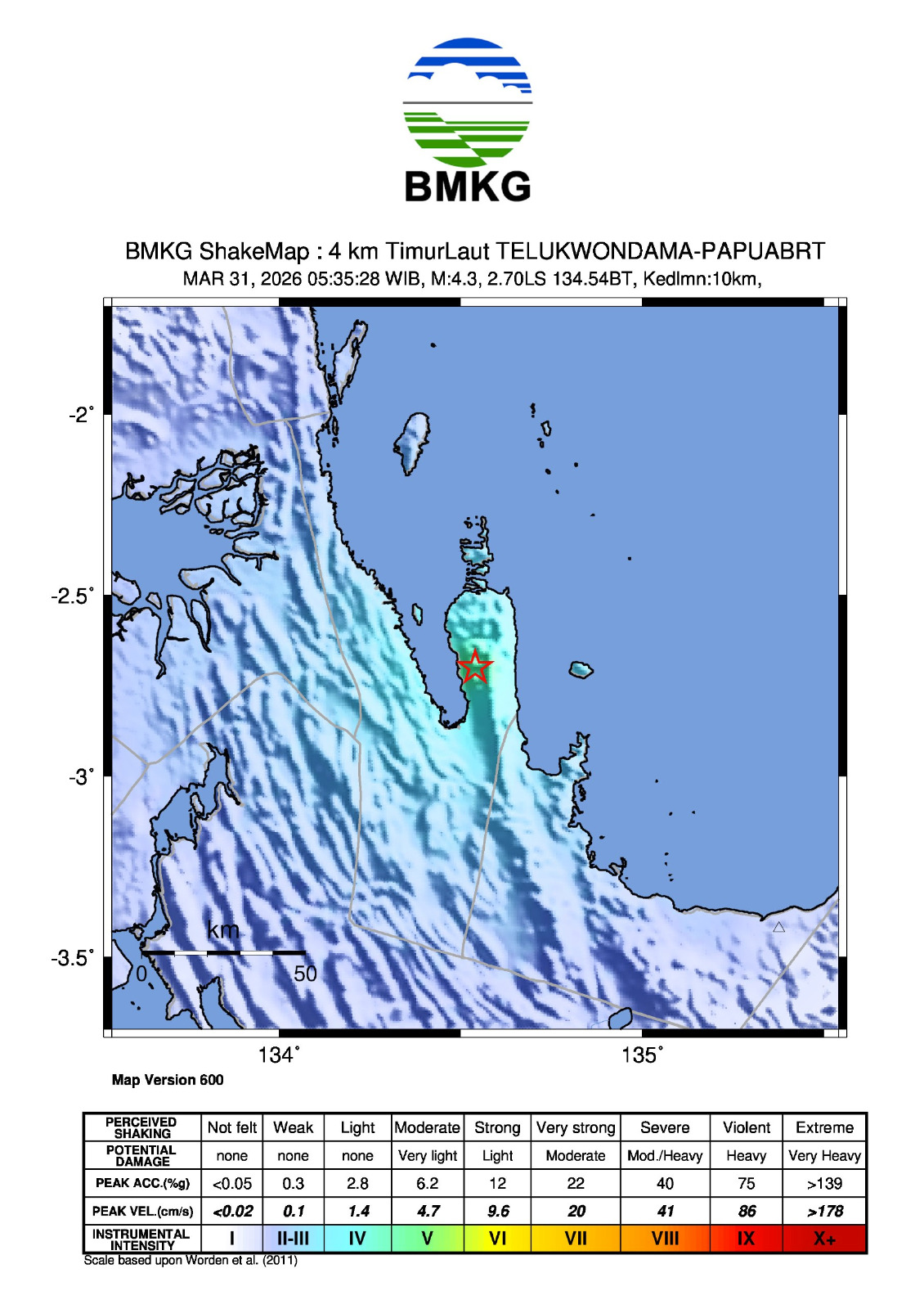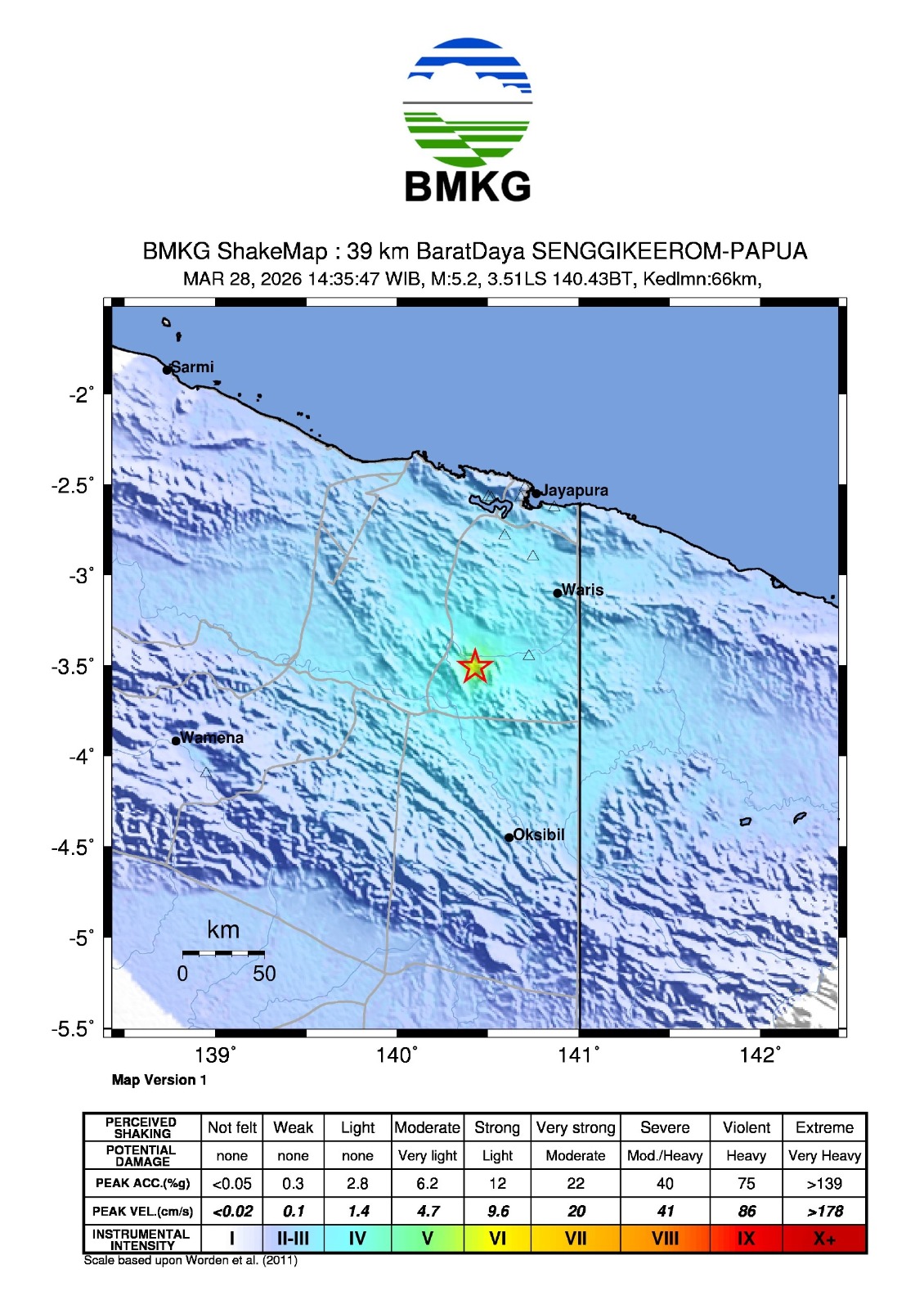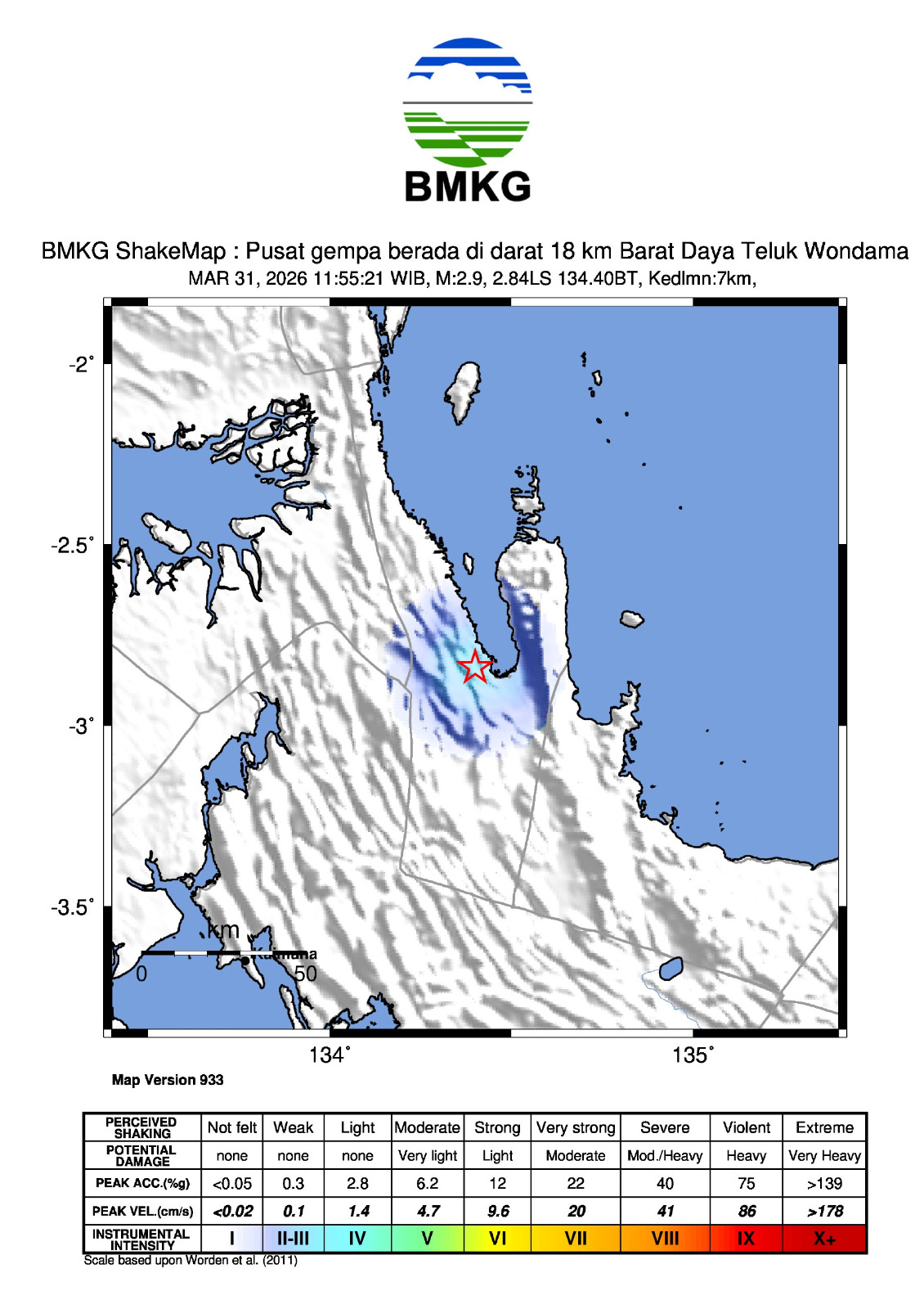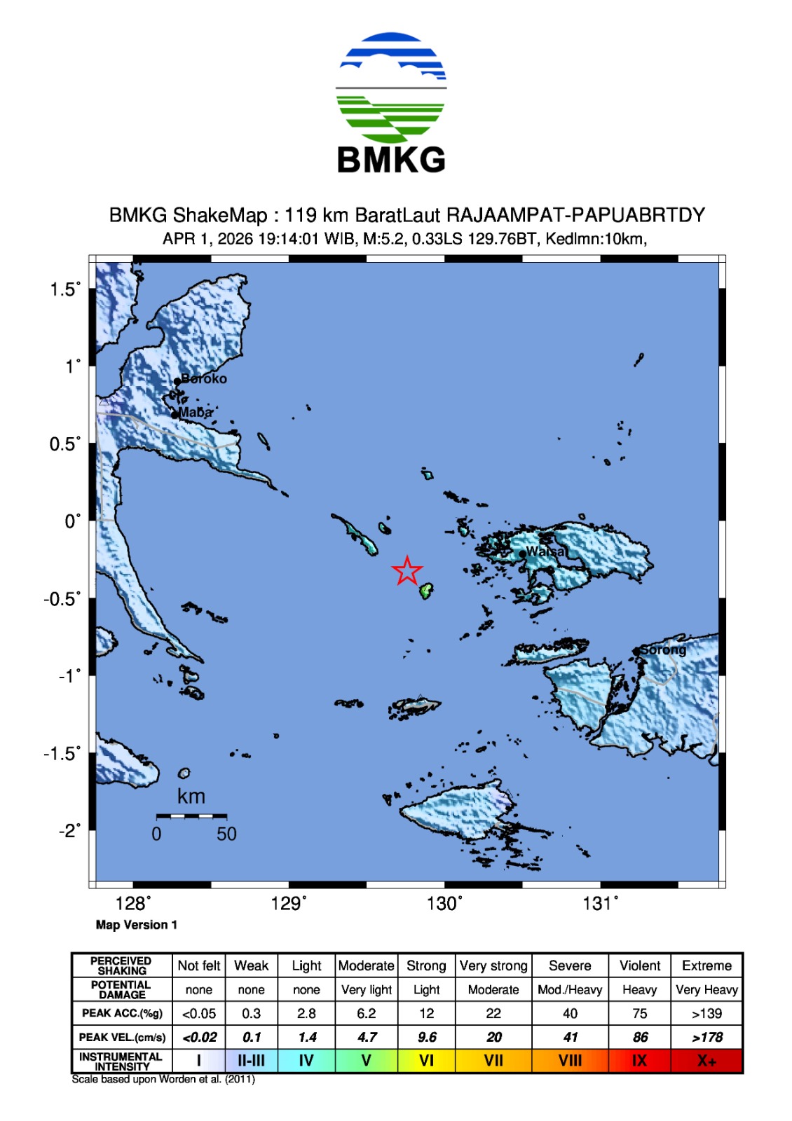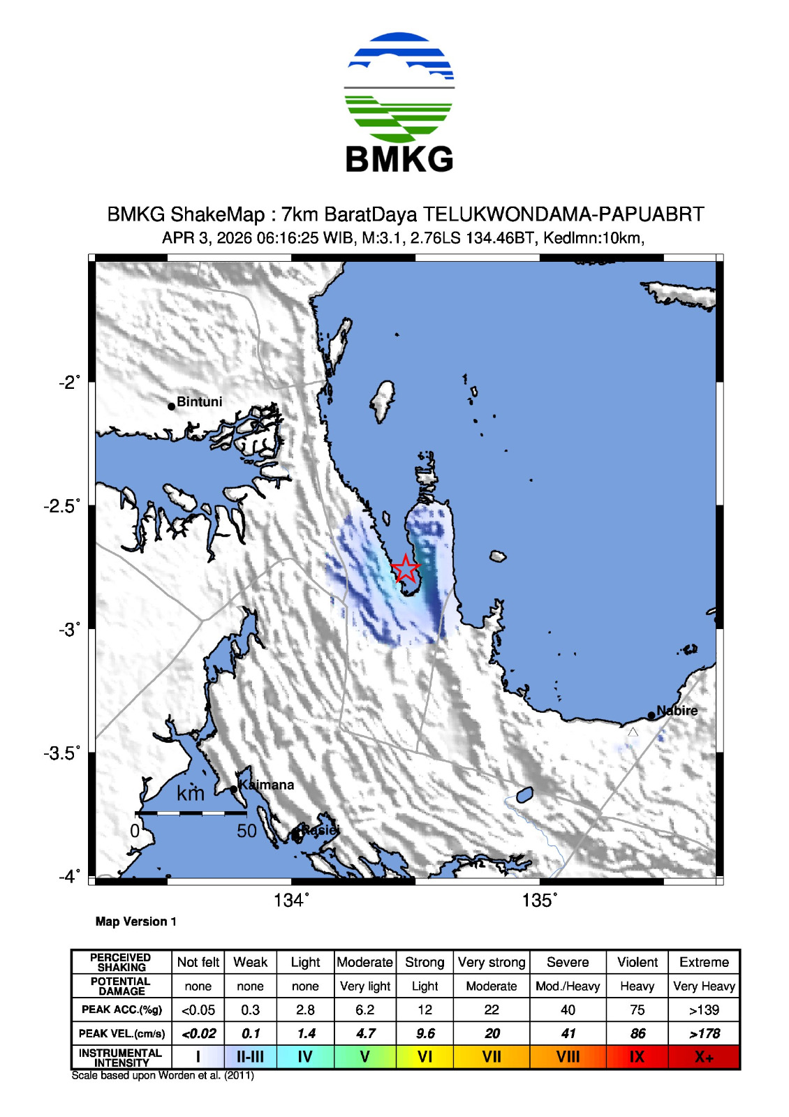 Berdasarkan informasi dari masyarakat. Gempa bumi ini dirasakan oleh masyarakat di daerah Kebar, Manokwari-Papua Barat dengan skala intensitas II-III MMI ( Getaran dirasakan nyata dalam rumah. Terasa getaran seakan akan truk berlalu )*.